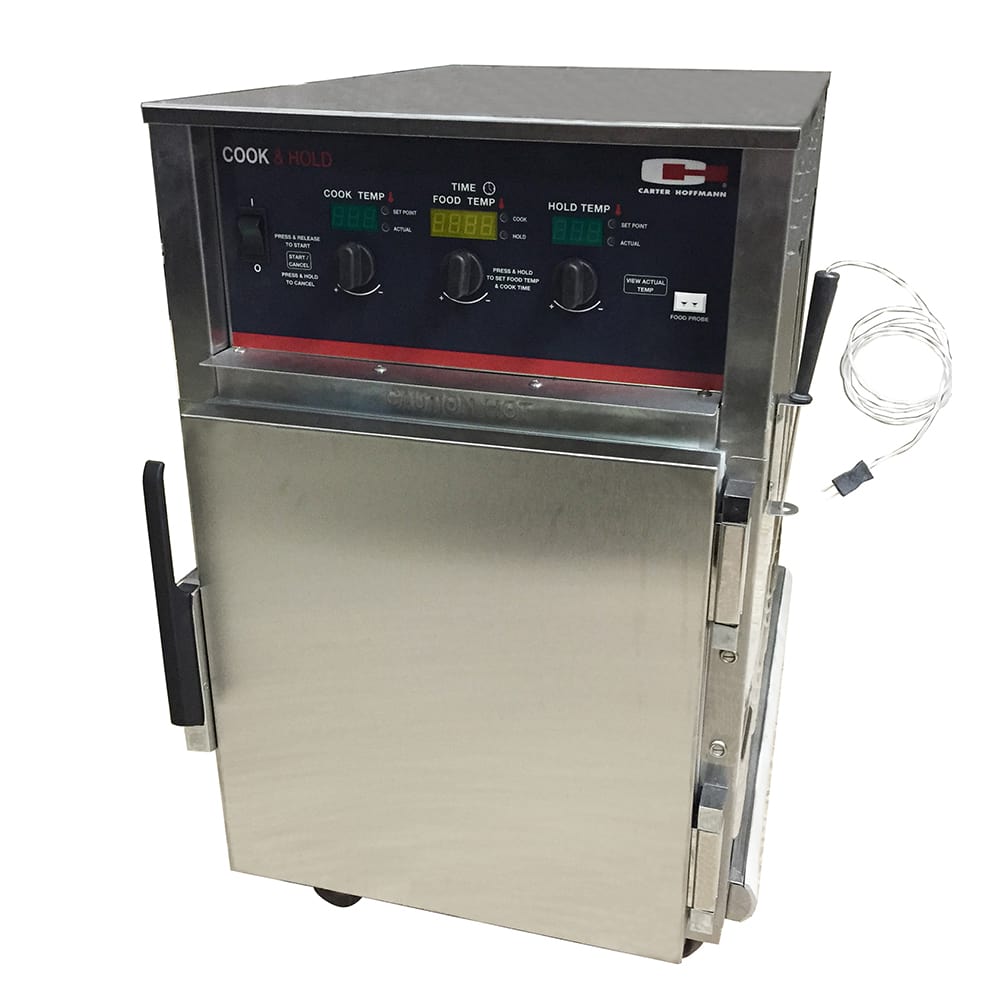 To ensure precise temperatures, the Carter-Hoffmann CH500 half-size cook-and-hold oven has a probe that monitors heat internally, reducing the risk of foodborne illness and helping prevent overcooking. The control panel includes a touchpad where users can view the temperature, setting it as high as 325 degrees Fahrenheit for cooking. When cooking is complete, operators can switch to the hold feature to maintain temperatures between 100 and 200 degrees Fahrenheit so food is still warm when served.