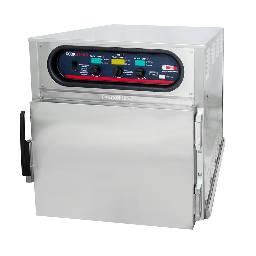 The Carter-Hoffmann CH750 undercounter oven has separate controls and displays for cooking and holding modes, while its thermometer shows the interior temperature at the push of a button. Items can be cooked at temperatures as high as 325 degrees Fahrenheit, and the holding cycle holds product between 100 and 200 degrees Fahrenheit. Cooking to a desired temperature or with an 18-hour timer is enabled by this unit, and its gentle heating system helps caramelize meats to produce juicy product. Heat inside the cabinet is spread evenly by the blower fan.
