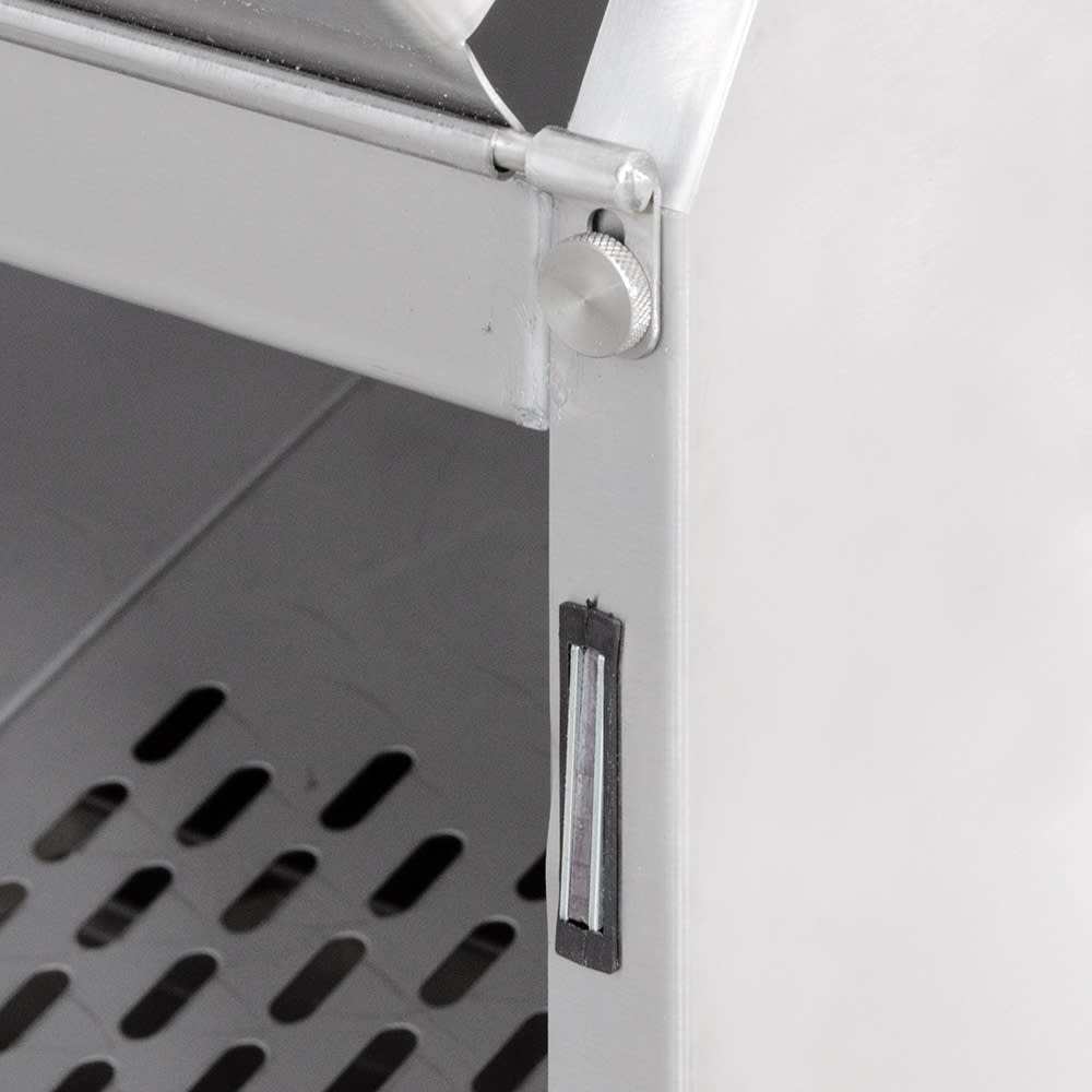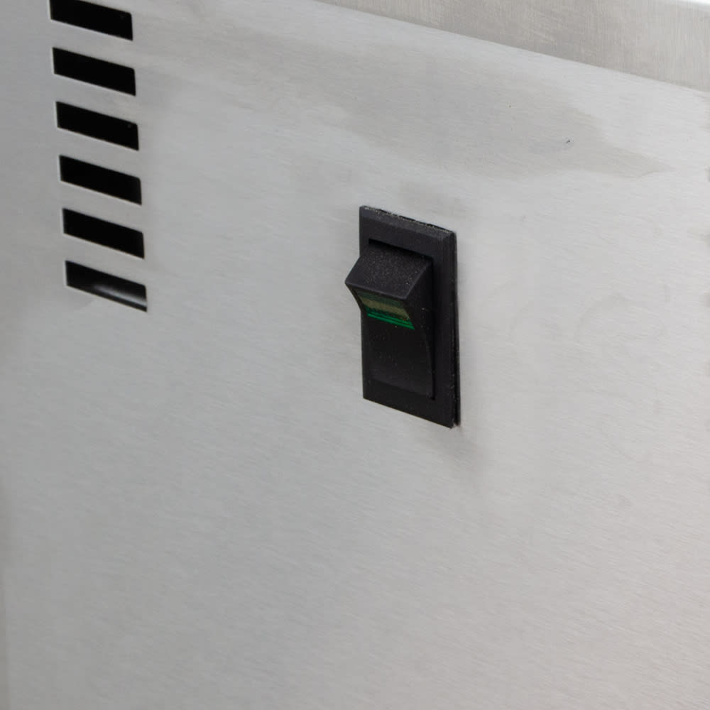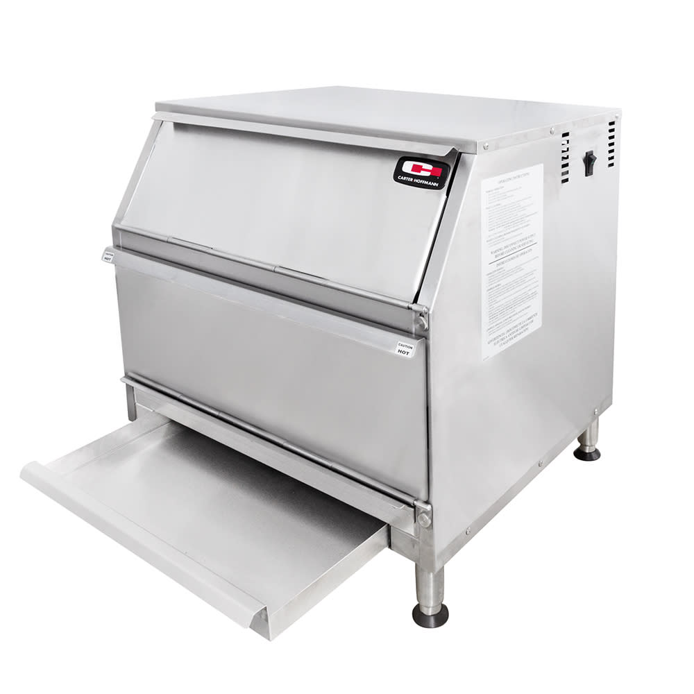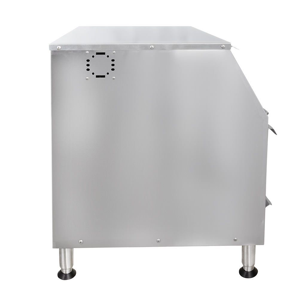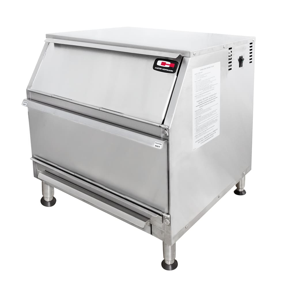 Warm air is directed through the duct and up through the chips at the bottom, keeping heat uniform throughout the cabinet. At the top of the cabinet, the heating system uses a blower fan to evenly heat the unit and recover temperatures quickly. This Carter-Hoffmann CW1 chip warmer can operate at temperatures up to 190 degrees Fahrenheit, but is factory-set at 175 degrees Fahrenheit. This can be adjusted with tools through the access hole at the rear of the cabinet.