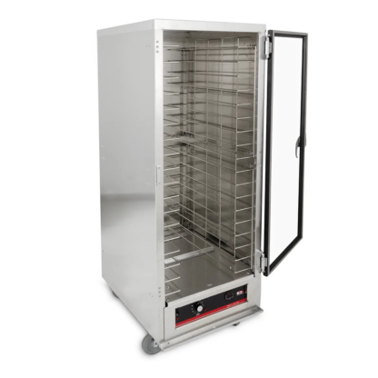This Carter-Hoffmann HL1-18 heated holding cabinet can preheat to 160 degrees Fahrenheit in about 30 minutes. Using the dial control, the cabinet temperature can be set to a level between 85 and 190 degrees Fahrenheit. Blower fans circulate hot air in the cabinet, keeping contents heated throughout. Although this unit is not insulated, a gasket tightly seals the door to keep heat inside.