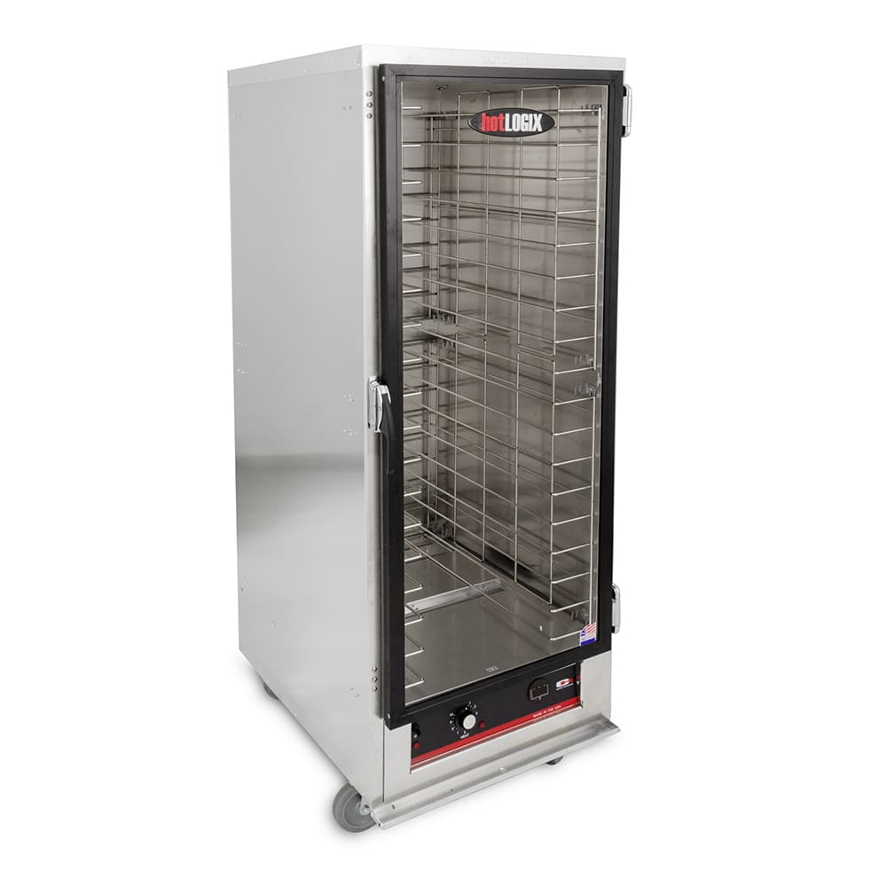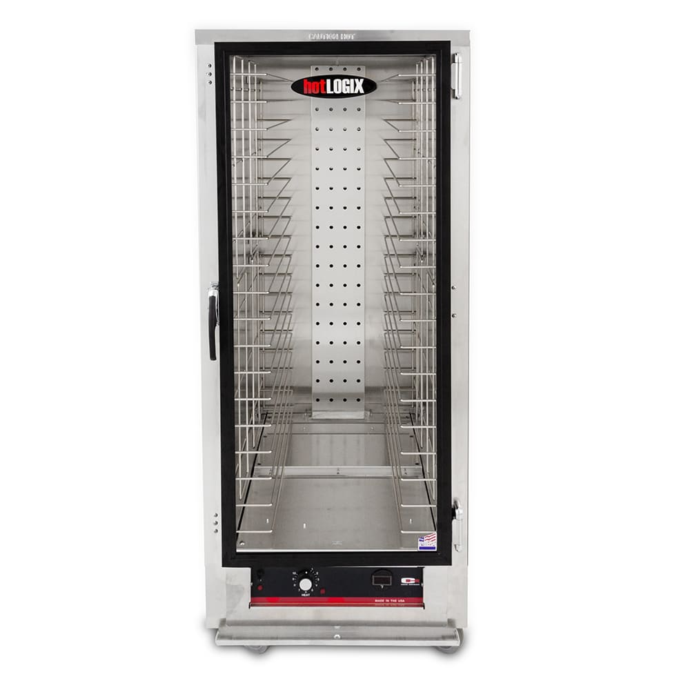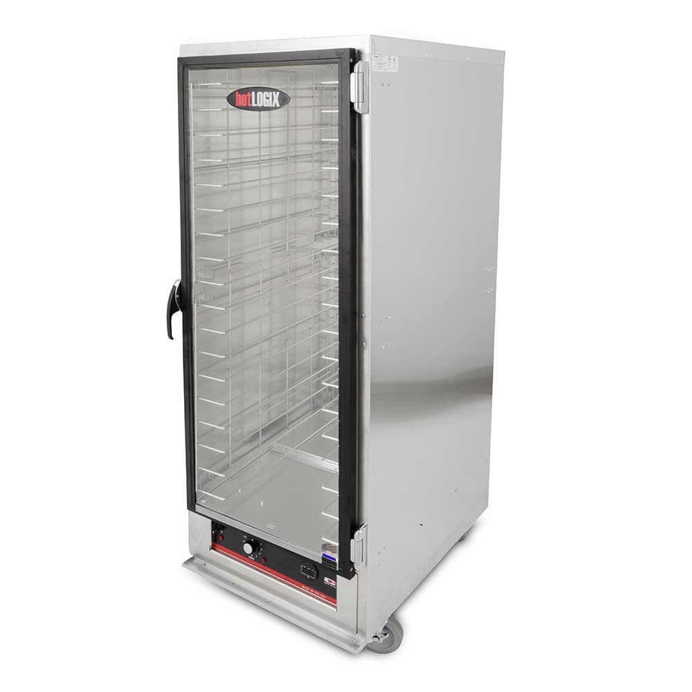 hotLOGIX Holding Cabinet-HL3 Series, one compartment, full height, insulated, (36) 12″ x 20″ or (18) 18″ x 26″ pan capacity, 3″ fixed wire universal slides, (1) single pane tempered glass door, bottom-mount forced air heating system, mechanical controls, digital thermometer, aluminum construction, (4) 5″ swivel casters (2 with brakes), cETLus, ETL-Sanitation (RapidShip)