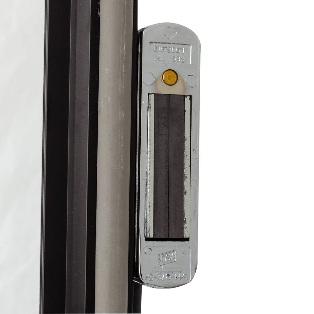 - Heavy-duty, edge-mounted latch has a magnetic catch