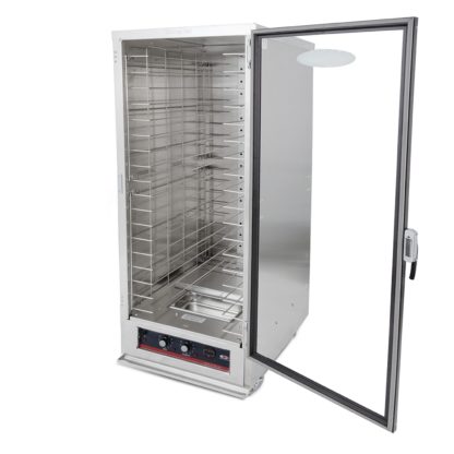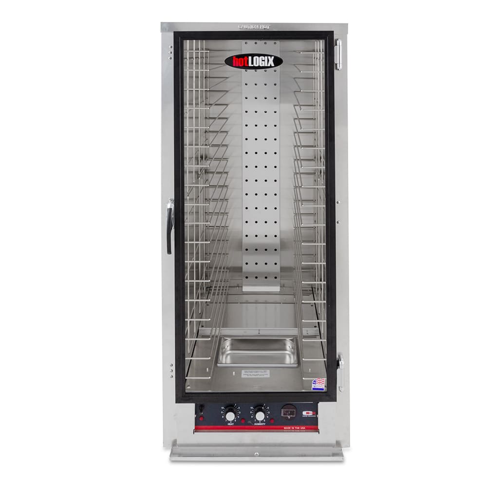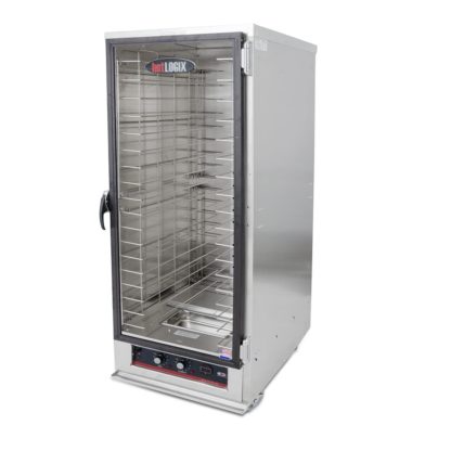 hotLOGIX Humidified Holding Cabinet/Heater Proofer-HL4 Series, one compartment, full height, insulated, (36) 12″ x 20″ or (18) 18″ x 26″ pan capacity, 3″ fixed wire universal slides, (1) single pane tempered glass door, bottom-mount forced air heat with water reservoir, mechanical controls, aluminum construction, (4) 5″ swivel casters (2 with brakes), ETL, ETL-Sanitation (RapidShip)