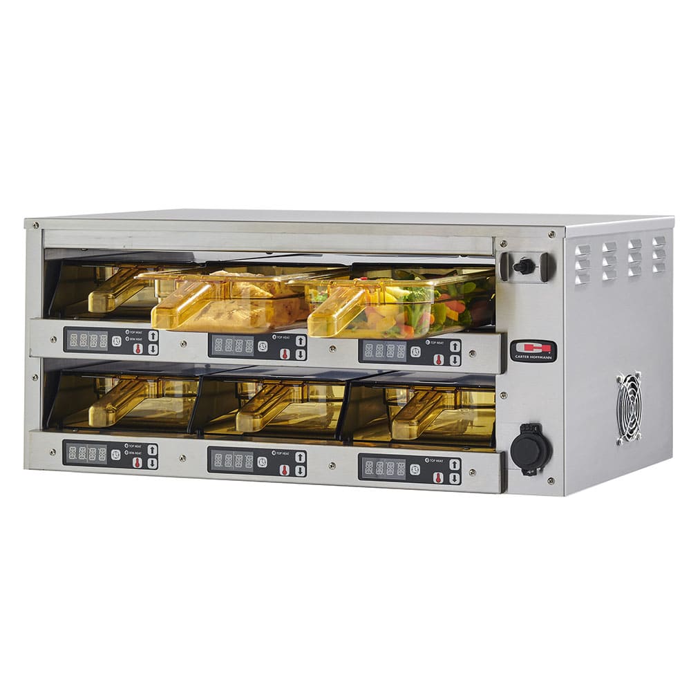 The Carter-Hoffmann M212S-2T drawer warmer holds six third-size, 21/2-inch-deep pans, and because these pans sit in separate sections, their time and temperature can be individually controlled. This design also prevents flavors from transferring between different products. Users can monitor cooking times and temperatures on the digital displays, and each pan cavity can support 25 programmable menu items for popular recipes through the USB port. When a holding cycle is complete, the audible alarm notifies the operator to prevent food from being held too long.