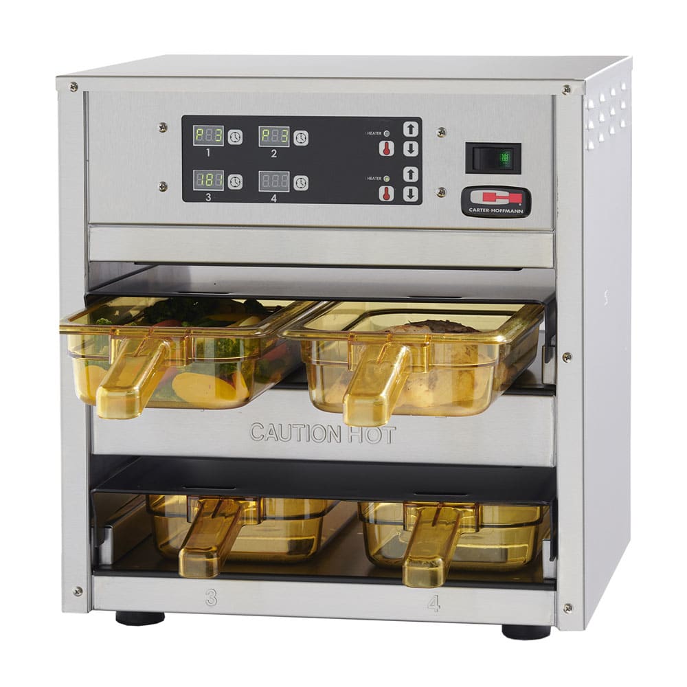 The Carter-Hoffmann MC223GS-2T countertop holding cabinet has two independently controlled shelves, and each shelf has its own countdown timer and electronic controls, so the unit can warm two different products at once. Adjustable in 1-degree increments, the temperature can be set to a maximum 195 degrees Fahrenheit. For freshness, the bottom of the shelves heat up evenly with anodized aluminum plates, and the included pan covers keep moisture in the product. These pan covers are removable to ease the cleaning process, and the unit’s stainless steel body wipes clean. To keep maintenance minimal, this Carter-Hoffman MC223GS-2T drawer warmer does not have hard-to-replace moving parts.