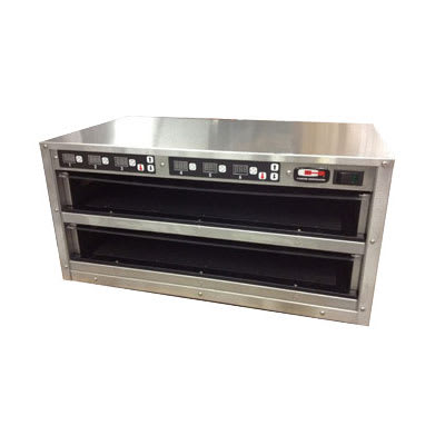 The Carter-Hoffmann MZ212GS-2T countertop drawer warmer keeps fried food warm without compromising its texture, and its built-in aluminum pan lid covers food to keep it warm and keep moisture out. The unit is insulated with millboard and constructed of stainless steel, which withstands heavy use. Each cavity comes with a heater in the top and bottom, as well as a timer with a maximum time of 9 hours and 59 minutes. The maximum temperature is 250 degrees Fahrenheit. Depending on their size, the Carter-Hoffmann MZ212GS-2T countertop heated holding cabinet can accommodate two, four, or eight pans.