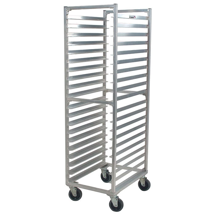 Pan Rack, 39-7/16″H, 20-1/2″W, 26-1/2″D, extruded side panels, (19) 18″ x 26″ trays, 1-1/2″ spacing, aluminum construction, end loading, 5″ casters