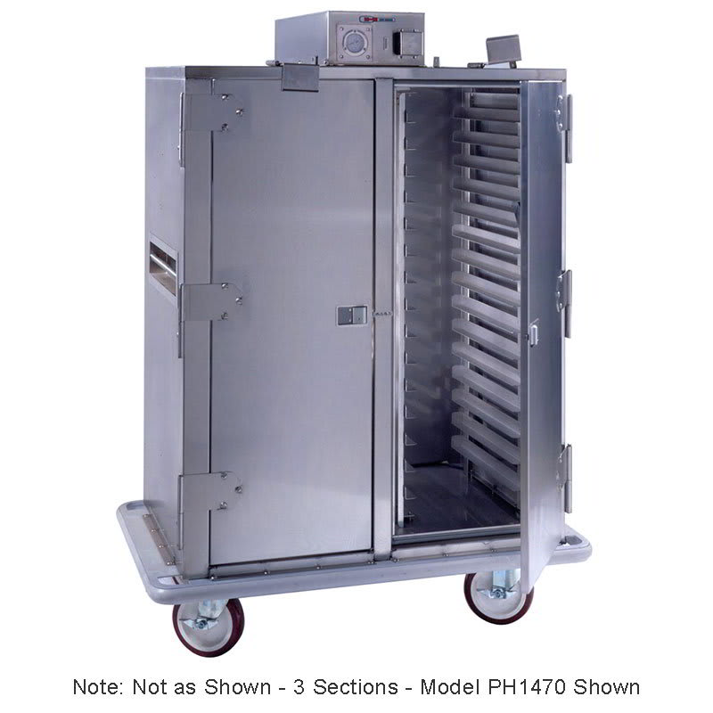 Heated Cabinet, HD correctional features, mobile, for compartment trays, insulated with top-mounted heater assembly, holds (90) 10″ x 14″, or (45) 14″ x 18″/15″ x 20″ trays, 3″ centers, stainless steel construction, wrap-around bumper, 8″ casters (2 swivel/2 rigid), 3 doors (sample tray required), cUL, ULeph, 120v/60/1ph