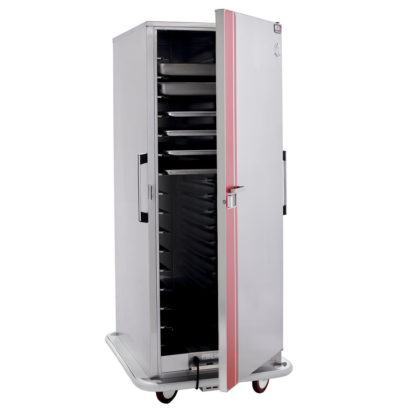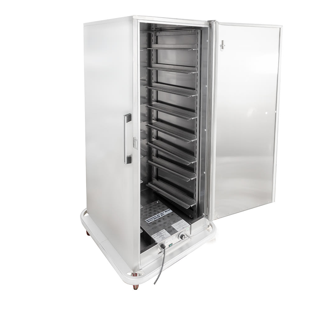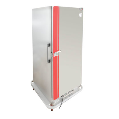 Heated Cabinet, mobile, insulated, bottom mount forced-air heat system, universal slides hold (32) 12″x20″ or (16) 18″x26″ pans, 3-1/2″ spacing, slides adjustable in 1-3/4″ increments, stainless steel construction, wrap-around bumper, 6″ swivel casters, cUL, UL EPH, CE (RapidShip)