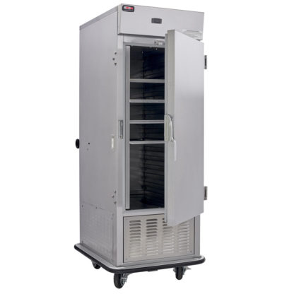 With a capacity for 15 full-size sheet pans or 30 full-size steam table pans, this Carter-Hoffmann PHB495 refrigerated meal delivery cart provides temperature-controlled storage to meet high-volume demand. Streamlining the loading and unloading process, its door can open 270 degrees and has a stay-open function that prevents it from closing unexpectedly. This cart’s 2.5-inch-thick walls are foam insulated, which helps them contain cold air to reduce energy consumption and compressor strain.
