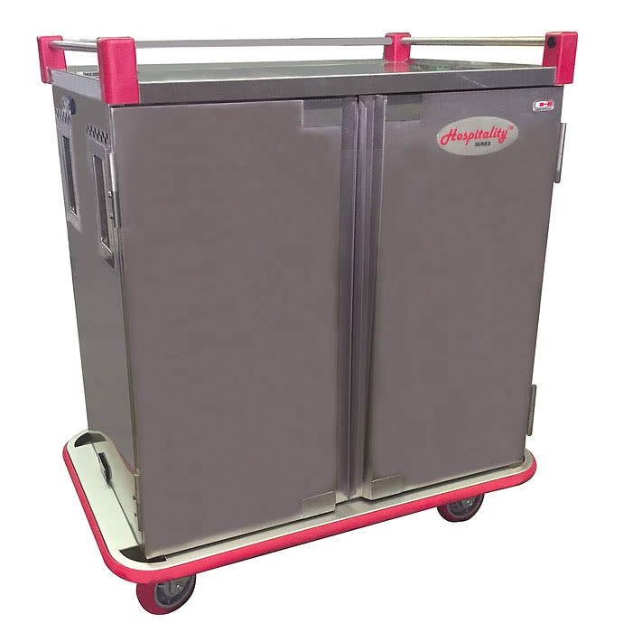 The Carter-Hoffmann PTDST20 meal delivery cart is constructed of stainless steel-a sturdy material that’s resistant to corrosion as well as denting and scratching. It can accommodate 20 trays and is designed with two compartments, each with a hinged door. To ensure quiet operation, it’s constructed with sound-dampening features and noise-suppression bearing covers on its casters.
