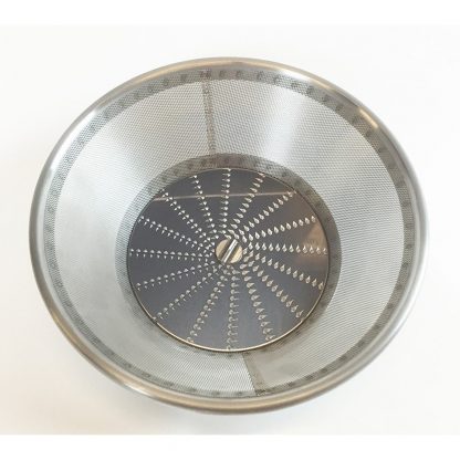 A complete basket assembly with a grating disk, center screw knife, male clutch, washer, and nut. The basket assembly comes completely assembled.
