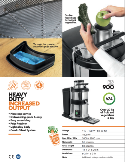 The Ceado ES900 is the latest generation, top of the line juice extractor with automatic pulp ejection. It has a “double-feed chute” for optimal extraction of juice from both fruit and vegetables! The ES900 has a stronger motor with higher torque, enabling the operator to process continuously, even with tougher ingredients. It also comes with the “through the counter” automatic pulp ejection container. It is intended for extremely high volume juice bars that consume over 44 pounds of fruit and vegetables per day.