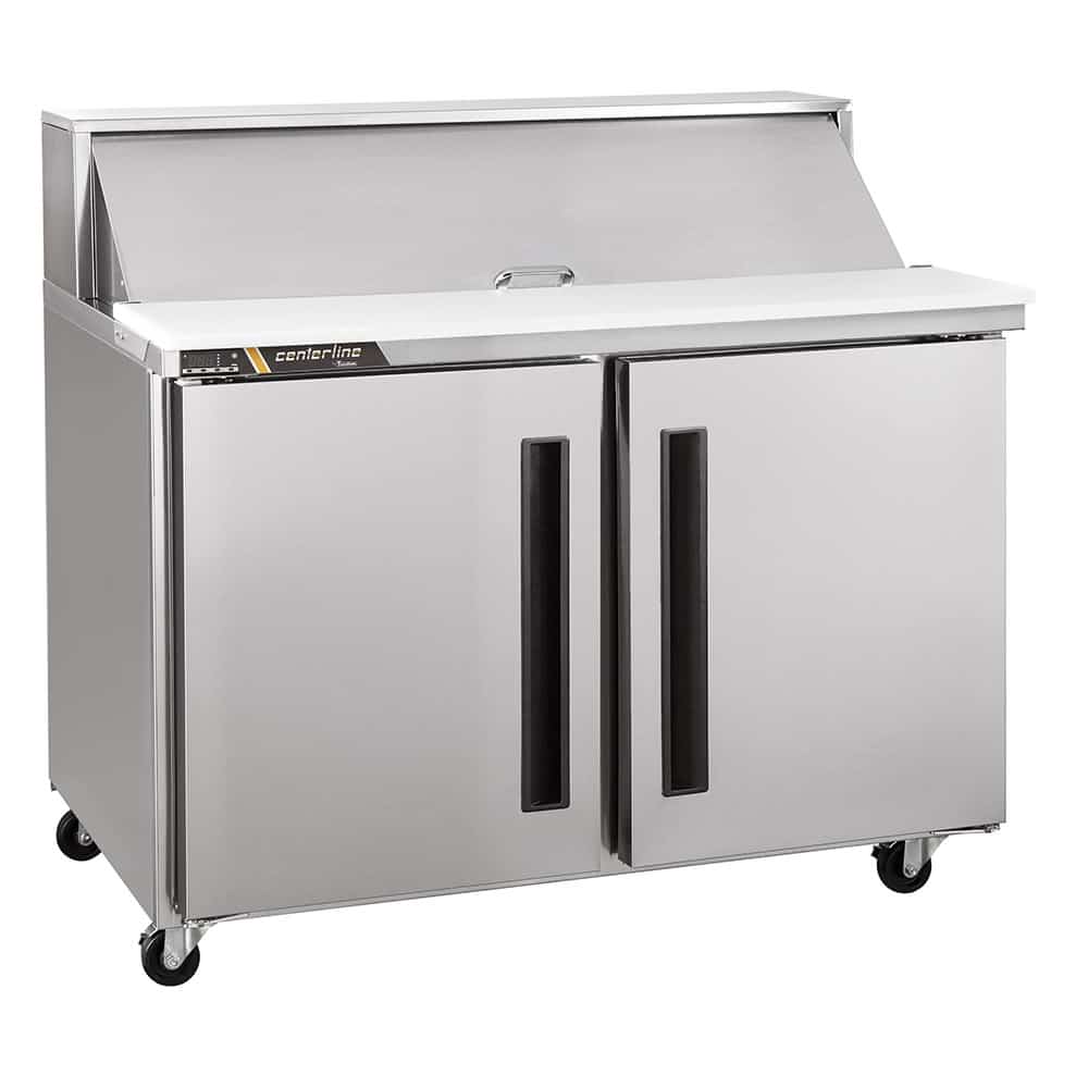 Centerline by Traulsen Compact Prep Table Refrigerator with roll-top lid, reach-in, two-section, 48″ wide, holds 12 (1/6) 4″ deep pans (included), rated for use with 6″ deep pans, stainless steel exterior, anodized aluminum interior, solid doors hinged left/right, field reversible. Full length removable cutting board. Electronic control with LED display, two epoxy coated shelves per section, 4″ casters, eco-friendly, non-flammable R450A refrigerant, 1/4HP, cETLus, NSF