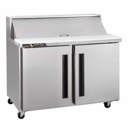 Centerline by Traulsen Compact Prep Table Refrigerator with roll-top lid, reach-in, two-section, 60″ wide, holds 16 (1/6) 4″ deep pans (included), rated for use with 6″ deep pans, stainless steel exterior, anodized aluminum interior, solid doors hinged left/right, field reversible. Full length removable cutting board. Electronic control with LED display, two epoxy coated shelves per section, 4″ casters, eco-friendly, non-flammable R450A refrigerant, 1/4HP, cETLus, NSF