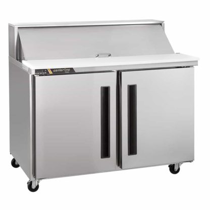 The Centerline by Traulsen CLPT-6016-SD-RR prep table’s refrigerated cabinet has two sections, with two heavy-duty, epoxy-coated shelves per section. Each shelf can hold 150 pounds and can be raised or lowered to accommodate various product heights. To ensure product temperatures remain stable, two solid doors are built into the cabinet, and they can be secured in 105-degree open positions for quick product loading and retrieval. The top section of the unit has cutouts that include 16 sixth-size pans with a 4-inch depth, and a cutting board is built into the table to streamline food prep. When the unit isn’t being used, a roll-top lid can be pulled down to cover the food pans and their contents.