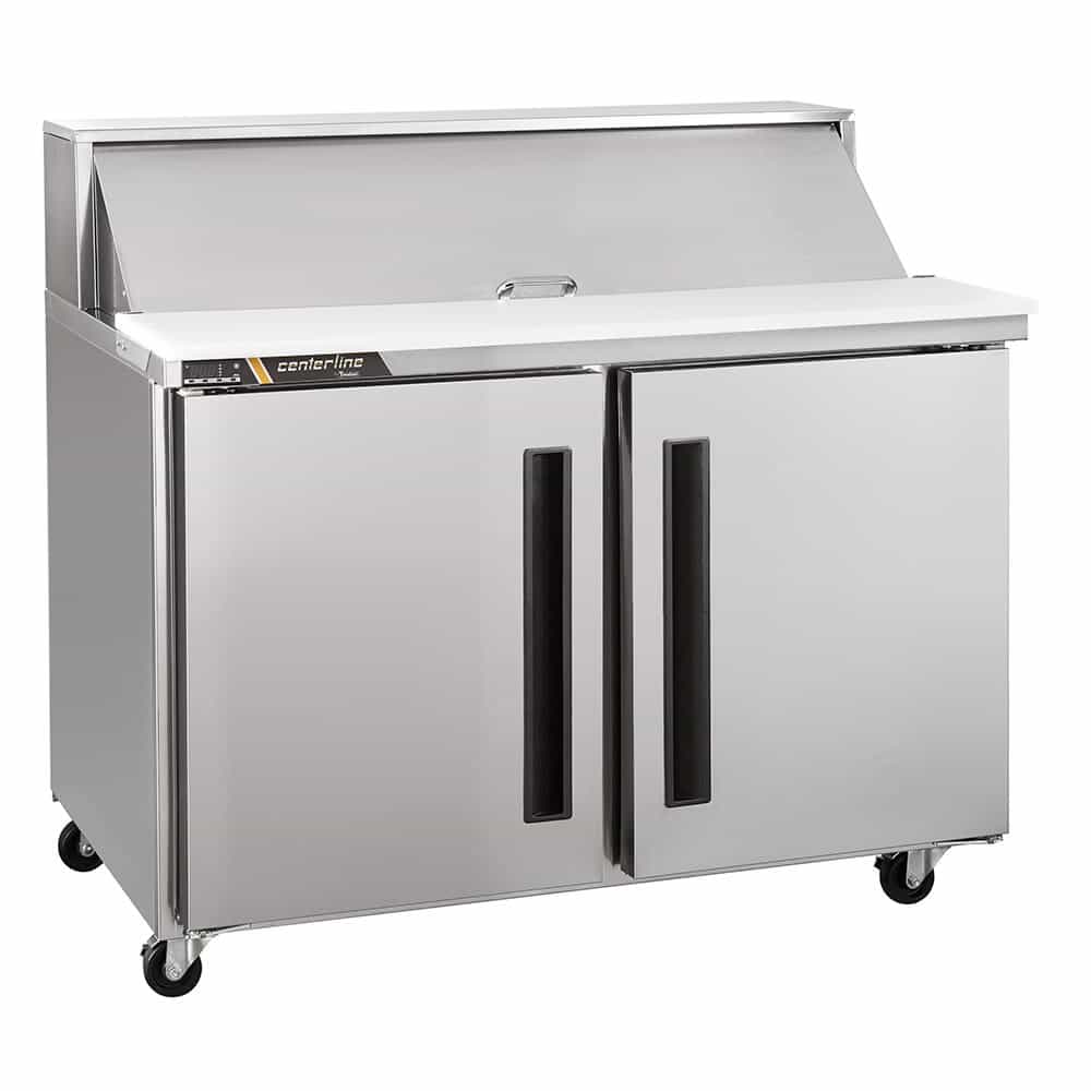 Centerline by Traulsen Compact Prep Table Refrigerator with roll-top lid, reach-in, two-section, 60″ wide, holds 16 (1/6) 4″ deep pans (included), rated for use with 6″ deep pans, stainless steel exterior, anodized aluminum interior, solid doors hinged right/right, field reversible. Full length removable cutting board. Electronic control with LED display, two epoxy coated shelves per section, 4″ casters, eco-friendly, non-flammable R450A refrigerant, 1/4HP, cETLus, NSF