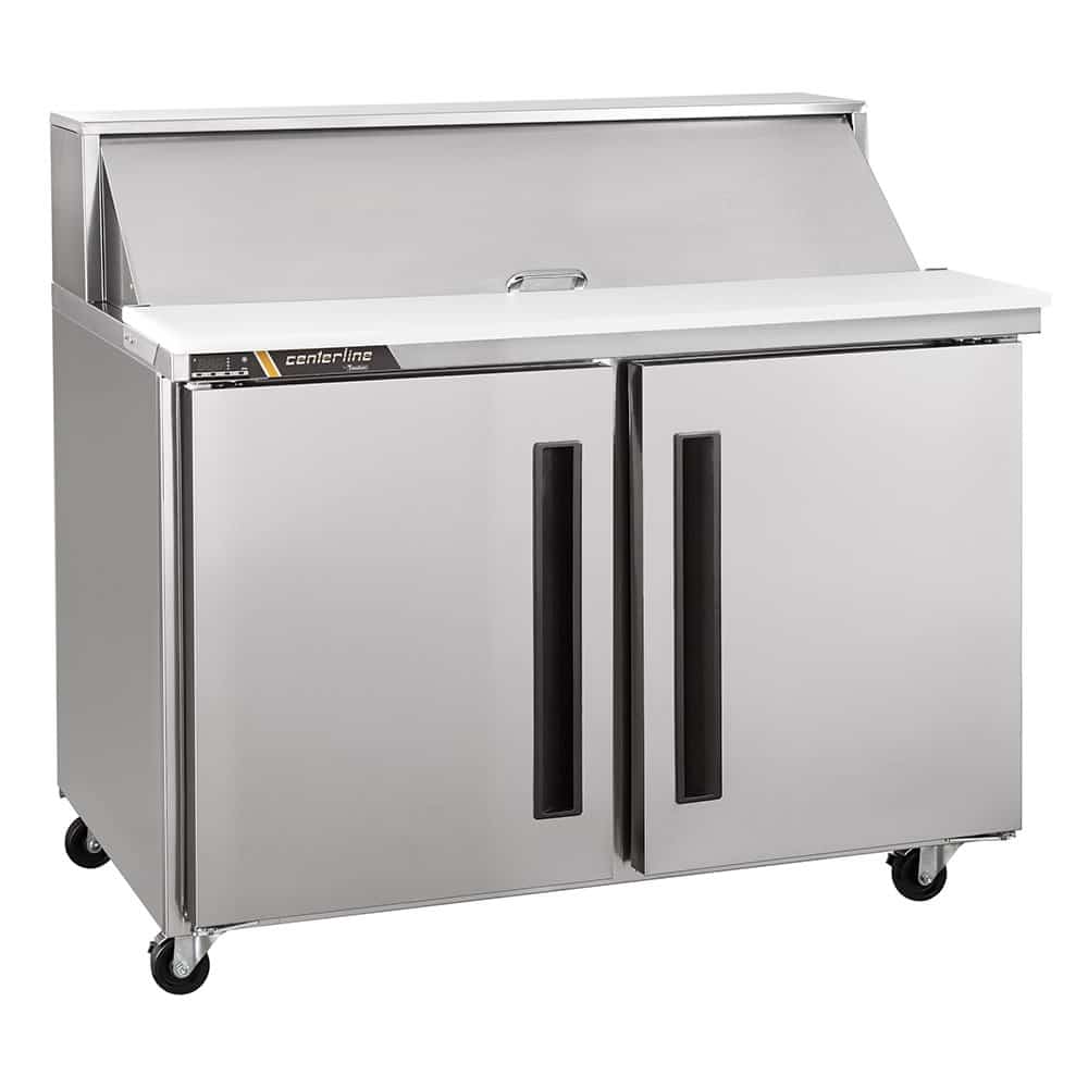 Centerline by Traulsen Mega Top Prep Table Refrigerator with roll-top lid, reach-in, two-section, 60″ wide, holds 24 (1/6) 4″ deep pans (included), rated for use with 6″ deep pans, stainless steel exterior, anodized aluminum interior, solid doors hinged left/right, field reversible. Full length removable cutting board. Electronic control with LED display, two epoxy coated shelves per section, 4″ casters, eco-friendly, non-flammable R450A refrigerant, 1/4HP, cETLus, NSF