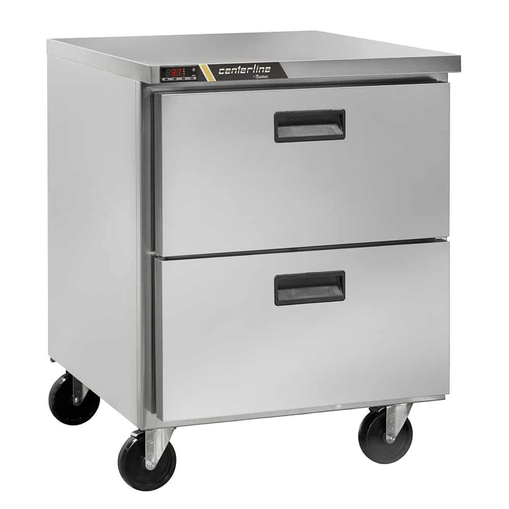 Centerline Compact Undercounter Refrigerator, 27″ W, 6.5 cu. ft. capacity, self-contained rear-mount refrigeration, (2) drawers, electronic control with LED display, stainless steel exterior, anodized aluminum interior, (4) casters, R450A refrigerant, 1/4 HP, 115v/60/1-ph, 3.3 amps, NEMA 5-15P plug, cETLus, ETL-Sanitation