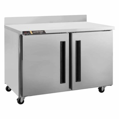 Centerline Compact Undercounter Refrigerator with Work Top, two-section, 36″ W, 9.0 cu. ft. capacity, self-contained rear-mount refrigeration, (2) right hinged solid doors (field reversible), electronic control with LED display, (2) epoxy coated shelves per section, 4″ backsplash, stainless steel exterior, anodized aluminum interior, (4) casters, R450A refrigerant, 1/4 HP, 115v/60/1-ph, 3.3 amps, NEMA 5-15P plug, cETLus, ETL-Sanitation