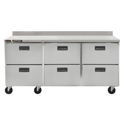 Centerline Compact Undercounter Refrigerator with Work Top, three-section, 72″ W, 18.80 cu. ft. capacity, self-contained rear-mount refrigeration, (6) drawers, electronic control with LED display, 4″ backsplash, stainless steel exterior, anodized aluminum interior, (4) casters, R450A refrigerant, 1/4 HP, 115v/60/1-ph, 3.6 amps, NEMA 5-15P plug, cETLus, ETL-Sanitation