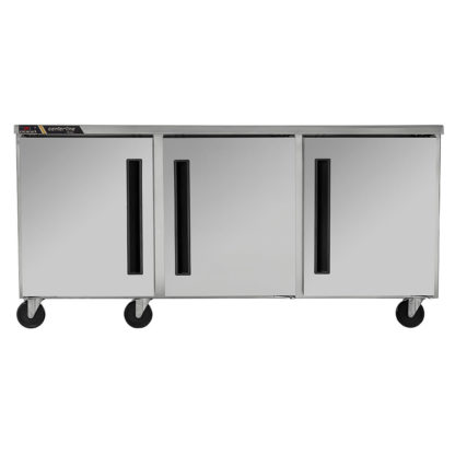 Centerline Compact Undercounter Refrigerator, Reach-in, three-section, 72″ W, 18.80 cu. ft. capacity, self-contained rear-mount refrigeration, (3) right hinged solid doors (field reversible), electronic control with LED display, (2) epoxy coated shelves per section, stainless steel exterior, anodized aluminum interior, (4) casters, R450A refrigerant, 1/4 HP, 115v/60/1-ph, 3.6 amps, NEMA 5-15P plug, cETLus, ETL-Sanitation