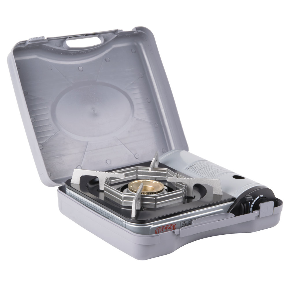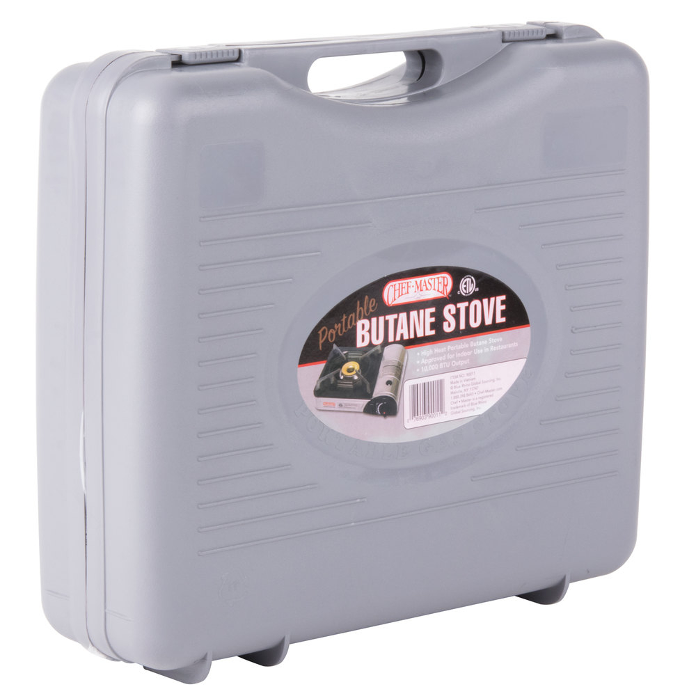 This Chef Master 90011 portable, high-performance butane stove is perfect for display cooking and off-site catering. This stove has a high heat output of 10,000 BTUs with an adjustable heat range from simmer to boil.