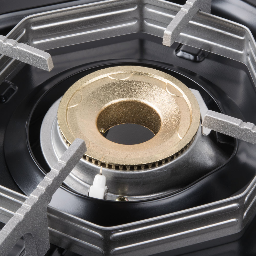 BRASS BURNER: The brass burner on this butane stove holds heat well, resists corrosion, and also resists warping or deforming.