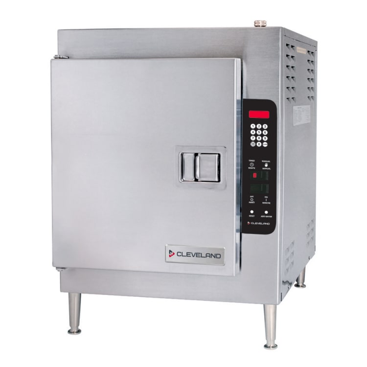The Cleveland 21-CET-16 convection steamer is made for countertop use and has a compact size and smaller power requirements than other models. All steam is generated inside the unit on the bottom of the steam compartment, and operators must pour 2 to 4 gallons of water into the cook compartment. The steamer’s design eliminates almost all water-related element failures, preventing the need for constant water treatment and deliming with caustic chemicals.