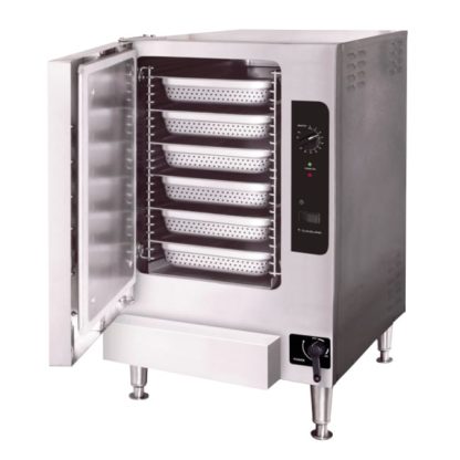SteamChef 6 Convection Steamer, Gas, boilerless, countertop, 1 compartment, (6) full size pan capacity, 60-minute electro-mechanical timer & manual (continuous steaming) bypass switch, left-hand hinged door, controls on right, automatic drain & water level controls, KleanShield interior, standard treated & tap water connection, stainless steel exterior, 4″ adjustable legs with flanged feet, 32,000 BTU, UL, ENERGY STAR