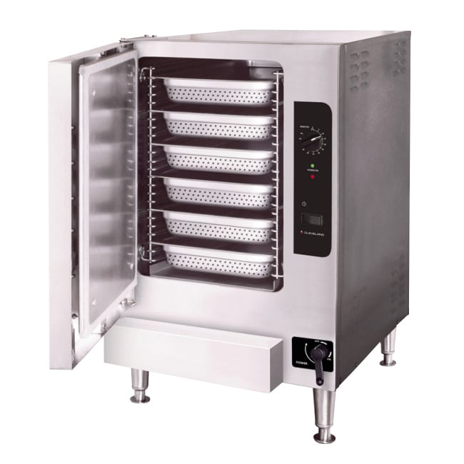 The Cleveland 22CGT6.1 SteamChef countertop steamer accommodates six full-size, 2.5-inch-deep steam table pans in its cooking cavity. Food in this unit is prepared with steam-a method that quickly cooks product while retaining the flavors and juices. Because the steamer has a water reservoir in the cooking compartment, it generates steam without an external boiler, so when the reservoir is heated with burners, the water turns into steam. Ensuring all product is evenly cooked, steam in the cavity is circulated by a convection fan.