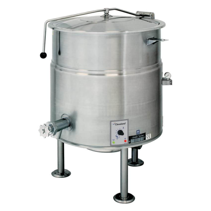 To endure high-volume, long-term use, the Cleveland KEL40 steam kettle’s exterior, interior, and liner are stainless steel-a durable, rust- and corrosion-resistant metal. This floor-model unit measures 303/4 inches wide by 40 inches deep by 40 inches high and is furnished with an open, tri-leg base and flanged feet for stabilization. It accommodates 40 gallons of product to heat large batches of soups and stews, and to streamline removal, the 2-inch-diameter, tangent draw-off valve expels product.