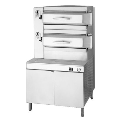 Pressure Steamer, gas, 36″ cabinet base, (2) compartments, (8) 12″ x 20″ pan or (4) 18″ x 26″ pan capacity per compartment, manual controls, 60-minute mechanical timer, 6″ adjustable legs with flanged feet, stainless steel construction, 300,000 BTU