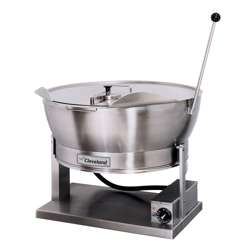 The Cleveland SET15 countertop tilting skillet has a 15-gallon capacity for medium-volume cooking and supports virtually any cooking method, from steaming and braising to searing and frying. Temperature is adjustable on the thermostat from 175 to 425 degrees Fahrenheit, while elements efficiently transfer heat to the pan bottom.