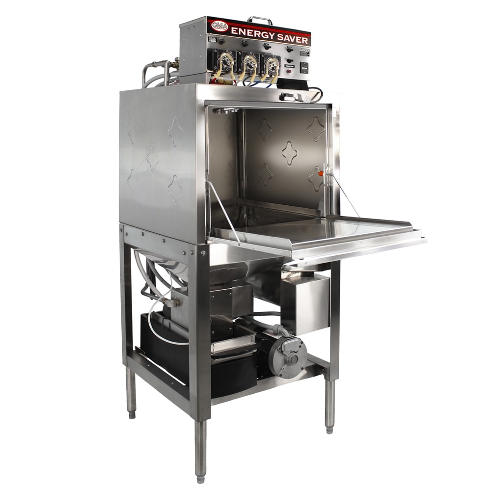 Energy Mizer/ Front Loader Dishwasher, low temp, 25-1/4″W x 25-1/4″D x 66″H, low water use, low temperature chemical sanitizing, top mounted controls, inside sump design, (40) racks/hour, built-in chemical pumps, scrap accumulator, self cleaning system, auto start/stop, stainless steel construction, 16″ tall pan clearance, 1 HP wash pump, ETL-Sanitation, cULus, ENERGY STAR/