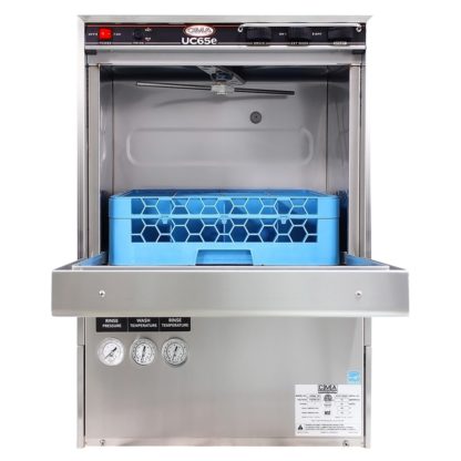 Upper and lower wash and rinse arms efficiently wash racked items, and if a cycle is running and the door is opened, the washer stops automatically to protect employees. The wash pump is protected from damage by stainless steel safety filters. All stainless steel wash arms in the top and bottom of the CMA UC65E-M2 undercounter dishmachine are removable for cleaning and replacing.