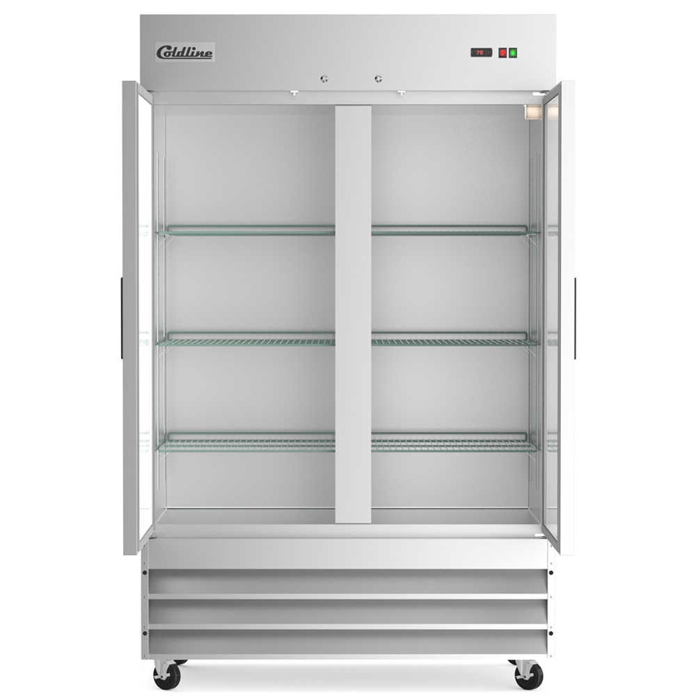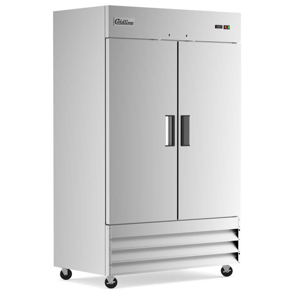 This double door reach-in refrigerator with 47 cubic feet capacity features a heavy-duty stainless steel interior and exterior, ensuring many years of dependability in even the most demanding commercial settings. Insulated self-closing lockable doors allow units to hold safe temperatures in the hottest kitchens. Included 6 wire shelves with clips. Lockable heavy-duty wheels come standard. This unit uses HYDRO-CARBON R290 refrigerant, which is environmentally friendly and more efficient than R134a/R404a refrigerant.