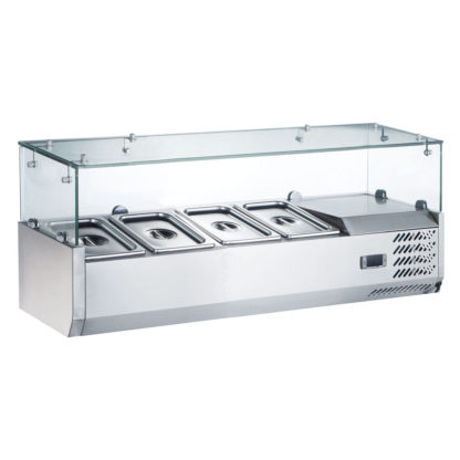 Keep salad, condiments, toppings, and other food items cold on this four pan countertop salad bar. This commercial refrigerated salad bar is perfect for pizza shops, restaurants, and food service establishments that serve a variety of cold salads. A self-contained unit, our salad bar refrigerator maximizes energy consumption and consistently maintains your toppings within the 33°F to 41°F temperature range. A digital temperature controller makes it super easy for your staff to adjust the temperature, while an automatic defrosts feature increases the efficiency of the unit.