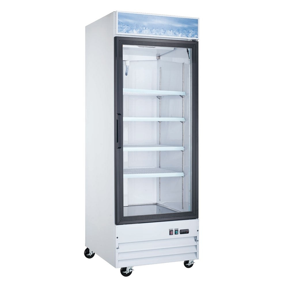 Showcase your soda and food in this 28 inches 1 glass door refrigerated merchandiser with LED lighting, 4 adjustable shelves, and heavy-duty lockable wheels standard. 1 self-closing anti-fog swing door provides easy access to your products. Standard 115V plug makes set up easy. Just plug it in and turn it on!