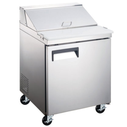 The SP 27″ refrigerated sandwich prep unit fits 6 x 1/6 size pans or 2 x 1/9 size pans. And it features a 10″ deep removable cutting board for easy cleaning, self-closing doors, and an insulated roll top to lock in cold air. The 5.7 cubic feet of storage inside includes an adjustable shelf. The 1/5 HP refrigeration system features auto defrost and is electronically controlled to keep your food in the safe zone. Durable and easy to clean stainless steel construction. The 29.5″ depth makes it a great addition to small kitchens.