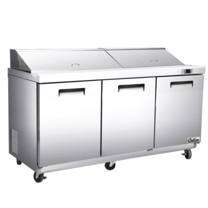 The SP 72″ refrigerated sandwich prep unit fits 18 x 1/6 size pans. And it features a 10.7″ deep removable cutting board for easy cleaning, self-closing doors, and an insulated roll top to lock in cold air. The 22 cubic feet of storage inside includes an adjustable shelf. The 1/4 HP refrigeration system features auto defrost and is electronically controlled to keep your food in the safe zone. Durable and easy to clean stainless steel construction. The 30.3″ depth makes it a great addition to small kitchens.