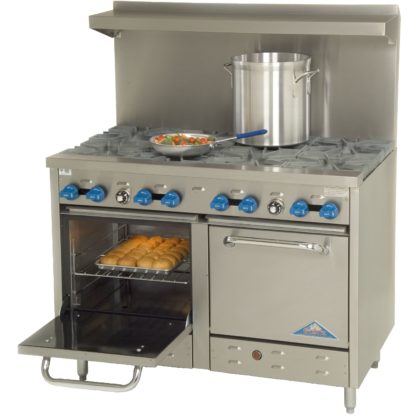 Range, gas, 48″ wide, (8) 24,000 BTU star burners with 12″ square cast iron grates, (2) space-saver ovens with enamel lining, (1) rack each, stainless steel exterior, with high shelf, 6″ stainless steel legs, 37″ tall to cook surface, 242,000 BTU, NSF, ETL