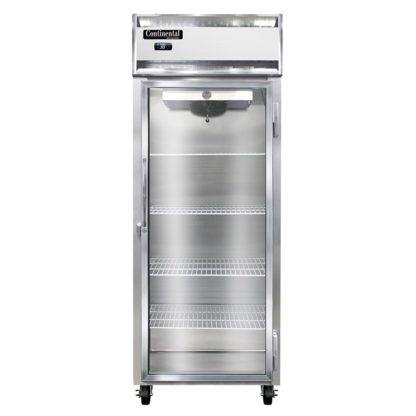The Continental Refrigeration 1RENGD reach-in refrigerator uses R-290 hydrocarbon refrigerant in its self-contained system to cool products on four shelves. These shelves are epoxy coated, protecting them from corrosion. With 21 cubic feet of capacity, this refrigerator can accommodate 24 tray slides. Its glass door facilitates interior product visibility without opening the door, saving time and energy. The self-closing door has locks to secure items and the magnetic latch seals tightly to stop cold air loss.