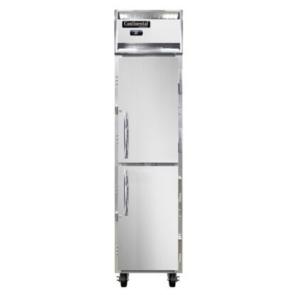 The Continental Refrigeration 1RSENSSHD reach-in refrigerator is insulated with 2 inches of non-CFC polyurethane foam to reduce energy costs. It is mounted on 5-inch casters for relocation to numerous places in the kitchen if needed. This refrigerator is cooled with R-290 hydrocarbon refrigerant, and the temperature can be adjusted using electronic controls. To view the temperature, this unit has a digital display and, if unusual changes occur, an alarm will sound to warn users that something is wrong.