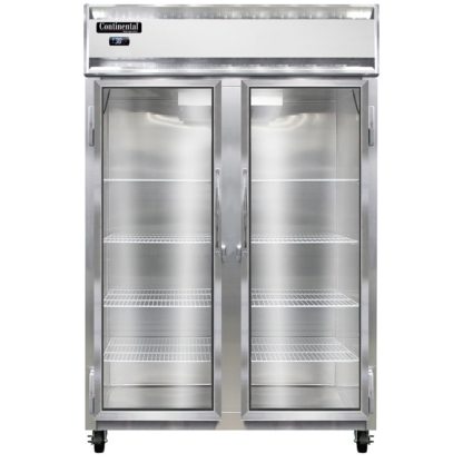 The Continental Refrigeration 2RNGD two-section reach-in refrigerator combats cold air loss with its snap-in, magnetic gaskets and self-closing door. However, if the temperature does spike, the expansion valve increases refrigerant flow to quickly bring it back down. Because the unit has glass doors, it saves operators on time and energy by letting them view refrigerator contents without opening a door and letting cold air out. Interior LED lighting keeps product illuminated in dark areas, and the unit is constructed of corrosion-resistant stainless steel, a material that is user friendly to maintain and clean because of its durable nature. To maximize storage, the refrigeration system is top-mounted, and since warm air exhausted from the condenser rises from the top rather than the bottom, it runs cooler than bottom-mounted models. This setup also helps keep kitchen areas colder.