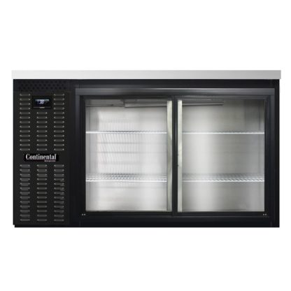 Refrigerated Back Bar Cooler, 59″W, 34-3/4″H, 22.0 cubic feet, front breathing, stainless steel top, sliding glass doors, electronic controller with digital display & hi-low alarm, black enamel finish exterior, stainless steel interior back & side panels with reinforced stainless steel floor, epoxy coated steel shelves, self-contained refrigeration, R290 Hydrocarbon Refrigerant, 1/4 HP, cETLus, NSF, Made in USA