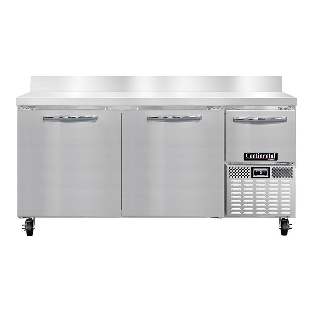 Freezer Base Worktop Unit, 68″W, 300 series stainless steel work top with 6″H backsplash, stainless steel front & end panels, galvanized steel rear & grill, aluminum interior, (2) full & (1) half height field rehingeable doors, electronic controller with digital display, unit comes standard with expansion valve, 1/2 HP, side-mounted refrigeration, cETLus, NSF, Made in USA