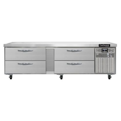 Designed to hold as much as 250 pounds, the Continental Refrigeration D84GN chef base has four drawers with polished chrome handles that glide smoothly when opening. These drawers can hold 6-inch-deep pans, and each drawer comes with one-piece magnetic gaskets and built-in safety clips. Its electronically controlled refrigeration system uses R290 hydrocarbon refrigerant and an expansion valve system with an automatic, hot gas condensate evaporator. For servicing, the front-sliding condensing unit is convenient to access, while the evaporator is plasticized to protect against corrosion.