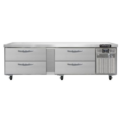 The Continental Refrigerator DL84GF commercial chef base’s four drawers offer bulk freezer storage for busy restaurant kitchens. Each drawer can hold two full-size food pans for a total of eight pans altogether. They are capable of holding 250 pounds each; this gives chefs the ability to store both dense and light products.