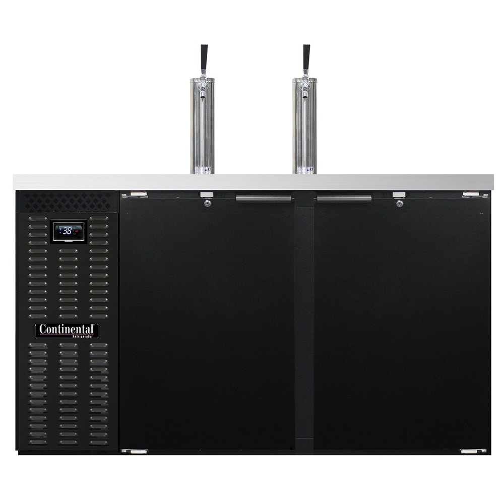 The Continental Refrigeration KC59N draft beer system includes two continuously cooled columns with lever faucets, carbon dioxide tubing with clamps, and a pressure relief distributor. To keep the unit clean, this beer system has a stainless steel drip grate with a cleanout drainage hose on the front and a slide-out condensing unit. Both lockable drawers are constructed with magnetic gaskets and high-density polyurethane insulation. Equipped with electronic controls, the front-breathing refrigeration system uses environmentally friendly R134A refrigerant, and the energy-saving condensate evaporator is automatic for straightforward operation. The low-profile cabinet of this Continental Refrigeration KC59N draft beer system is finished with black enamel and has a stainless steel exterior with a galvanized interior. For proper airflow, this unit has front-, rear-, and side-venting louvered grills.